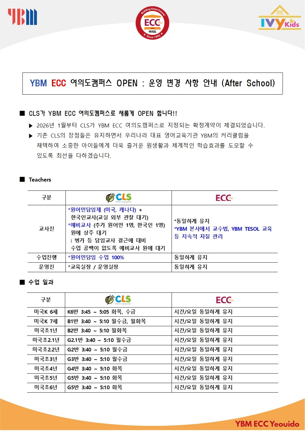 💝YBM ECC 여의도 Afterschool 유치부초등부 운영변경사항